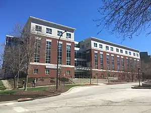 The view of the College of Arts and Sciences from the steps of the Honors College.