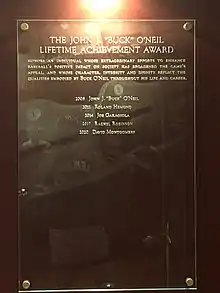In 2008, the Hall of Fame dedicated a life-size bronze statue of O'Neil near the entrance of its museum. With the statue are a list of recipients of the award and a plaque that summarizes O'Neil's contributions to the game of baseball.[1][3][2][4] A smaller statue is given to each honoree at the induction ceremony during Hall of Fame Weekend.[1]