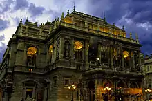 The Hungarian State Opera House (Hungarian: Magyar Állami Operaház) is a neo-Renaissance opera house located in central Budapest, on Andrássy út. Originally known as the Hungarian Royal Opera House, it was designed by Miklós Ybl, a major figure of 19th-century Hungarian architecture. Construction began in 1875, funded by the city of Budapest and by Emperor Franz Joseph I of Austria-Hungary, and the new house opened to the public on the 27 September 1884. Before the closure of the "Népszínház" in Budapest, it was the third largest opera building in the city; today it is the second largest opera house in Budapest and in Hungary.