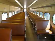 The design of the Budd Silverliner was based on a lightweight stainless steel body and frame coupled to an advanced AC/DC rectifier propulsion system and new lightweight, high-speed trucks. While largely identical to the earlier Pioneer IIIs, differences included a single-arm Faiveley pantograph, a state-of-the-art propulsion system that made use of solid-state phase angle controllers coupled to mercury arc ignitron rectifiers, higher-powered motors, a higher-capacity main transformer, multi-function couplers and disc brakes. One result of these upgrades was that the Silverliners were incompatible with the six Pioneer prototypes. Passenger amenities were also identical to the Pioneer III cars offering riders air cushion suspension, air conditioning, electric train heat and a nearly silent acceleration and braking. With 150 hp (110 kW) more than the Pioneer III cars (550 hp or 410 kW total), the Silverliners could achieve a 1.7 mph/s (2.7 km/(h⋅s)) acceleration rate, which was far higher than the older MP54s[1] and a top speed of 85–100 mph (137–161 km/h) compared with the 55–65 mph (89–105 km/h) of the MP54 fleet (which was not often reached in service).[1] Inside, the cars were equipped with 25 rows of 3+2 reversible (flipover) bench seating with 124 usable seats and either a bathroom or an additional 3-person bench seat. The seats were initially furnished in a dark gray diamond-patterned foam rubber "plush", which began to wear out by the mid-1970s. Four cars (#259, #269, #9012 and #9015) were experimentally retrofitted with brown vinyl leatherette seats. However, the balance of the fleet was redone in the SEPTA/Conrail era with canvas-textured padded covering in a so-called "Ketchup and Mustard" theme, with the three-person seats upholstered in mustard yellow and the two-person seats done in a dark ketchup red.