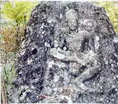 Kalkata-iii is square block of stone shows reliefs on its three sides. It lies just above Kalkata-ii and not in situ. Wild bushes and shrubs have thickly covered the rock all around. According to the local people it depicts on its three sides three different statues. Presently only two sides where carvings are visible revealing dhyani Buddha on the top and undefined Bodhisattva in lilatasana in pensive attitude on the west. His right hand rests on the right thigh, while the left one on the left thigh holding lotus stem. The carvings are in bad state of ation.