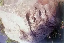Measurements of the boulder: 1180 x 2300 cm H. 700 x W. 500 x D. 11 cm Material: Reddish sandstone Reference: Published (See below note 1) Orientation: Facing North West Map ref. Topographic sheet. 43 B/5 (8947)[6]