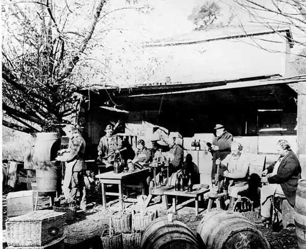 Buena Vista Winery was founded in 1857 by Agoston Haraszthy a Hungarian from Budapest.[3] Haraszthy was unable to sustain the estate financially, and in 1863 financial support came by way of the Buena Vista Vinicultural Society; a group of financiers led by San Francisco banker William Ralston. Within two years of the society's founding, Buena Vista was producing two million gallons of wine a year. The success of the budding wine industry in California led to wine prices dropping dramatically as expenses rose. In 1866 Haraszthy was forced to resign from his position of superintendent of the winery. During the 1870s the winery would produce about 100,000 gallons of wine a year from approximately 500 acres of vineyards. Sparkling wine was a popular seller. During the depression of 1873-77 the society was forced to liquidate its assets and file for bankruptcy. The estate, in the 1880s, would become the home of businessman Robert C. Johnson.[5]