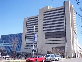 Kaleida Health runs the Buffalo General Medical Center, a hospital on the premises of the Buffalo Niagara Medical Campus. It was founded on its current site in the mid-19th century[4] and has undergone expansions ever since, including one in 1986 that added a 16-story tower to the main complex.[5] The hospital had 24,000 inpatient visits in 2016.[6] The interior lobby was remodeled and the exterior of the building was repainted in 2018 to match the color scheme of newer facilities on the campus at a cost of $2 million.[6][7] Kaleida also runs the John R. Oishei Children's Hospital, a children's hospital that opened in November 2017, replacing Women and Children's Hospital of Buffalo and cost $270 million and nearly three years to build.[8][9][10] There are 185 beds, including 64 neonatal units, 14 operating rooms, an indoor garden and skyway connections to both Buffalo General Medical Center and Conventus.[10] The hospital broke ground in early 2015 and was designed by Shepley Bulfinch and built by Turner Construction.[10]