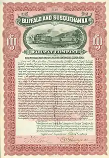 In 1901, a $15,000,000 mortgage on the property of the Buffalo & Susquehanna Railroad Company was filed in the Register and Recorder's office at Wellsboro, Pennsylvania.[30] Fisk & Robinson, one of the best-known bond houses in Wall Street funded the bond. This money helped the railroad fund the railroad's operations, and its expansions south to Sagamore and north to Buffalo.