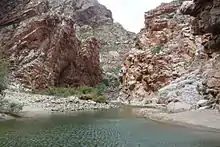 The deep gorge and river valley is located some 10 km from the western limit of the Swartberg range, in the section known as the Klein Swartberge. After exiting Floriskraal Dam, the Buffels River enters the Swartberg's foothills or Wit Nekke, before it enters Buffelspoort from the north.[1][2] The 9 km long gorge connects the northern foothills of the Swartberg with the Little Karoo in the south, where the Buffels River exits the defile. Downstream from this point the Buffels is known as the Groot River.