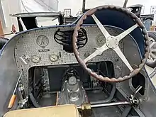 The arch/egg-shaped[1] radiator is emblematic, as is the rear of the car. The tapered stern has been called a 'Bordino tail' and Ettore Bugatti may have been influenced by the shape of the earlier Fiat 804 driven and modified by Pietro Bordino.[2] The car has also become synonymous with being the first to use cast alloy wheels.[3][4]