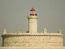 Attacks by French and Turkish pirates, especially in 1552 and 1556, demonstrated the need for Portugal to strengthen the defence of Lisbon. This led to the decision to fortify the island of S. Julião da Barra in the River Tagus estuary in 1556. The fort of São Lourenço do Bugio followed in 1590. As early as 1693, the fort is believed to have already possessed a light to aid navigation. An inspection of the lighthouse in 1751 reported that the fire was fuelled with olive oil and operated from October to March. This original lighthouse was destroyed during the 1755 Lisbon earthquake but in 1758, Sebastião José de Carvalho e Melo, 1st Marquis of Pombal ordered the construction of six new lighthouses, including a new one at Bugio. In 1775, the new lighthouse came into operation, illuminated by an Argand lamp with parabolic reflectors. In 1829 a new rotating mechanism driving 16 lamps was installed and in 1896, a 3rd order optics device with a new oil supply was installed.[2][3]