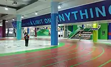 The station originally featured a similar design and ambience with other LRT stations, with roofs supported by latticed frames, and white plastered walls and pillars. It received a facelift in conjunction with the 2017 SEA Games and the renovation of the National Sports Complex as KL Sports City, being revamped with a sporting theme. The revamp features colourful and vibrant graphics, sports symbolisms, and inspirational quotes installed inside and outside the station, such as on the walls and staircases. The floor itself is painted to emulate a relay track, with the faregates acting as the end/beginning of the painted track.[3]