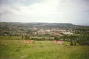 The city is flat and compact, forming a bowl as it is surrounded by hills. The town has a bus stand,[6] a big airport[7] and a port[8] with a ferry that used to travel from Bukoba via Kemondo bay port to Mwanza on Monday, Wednesday and Friday nights, but was suspended in 2014 when the ferry broke down irreparably.[6]