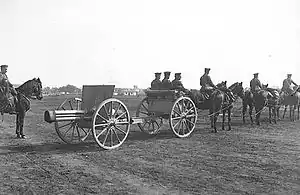 1915 also saw the birth of the anti-aircraft component of the Bulgarian armed forces. The first such specialized formation was a mixed battery of six guns (2 quick-firing 75 mm Krupp guns and 4 not quick-firing 87 mm Krupp guns), seven machine guns (five Madsen and two Hotchkiss), which was deployed around Sofia.[81]