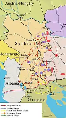 On September 22, Bulgaria declared general mobilization and Radoslavov stated that country would assume a state of "armed neutrality" that its neighbors should not perceive as a threat.[70] This event was indicative of Bulgarian intentions and prompted the Serbians to ask the Entente to support them in a pre-emptive strike on Bulgaria. The Allies were not yet ready to help Serbia in a military way and refused, focusing their efforts instead on finding ways to delay as much as possible the seemingly imminent Bulgarian attack. Sazonov, angered by this "Bulgarian betrayal", insisted that a clear ultimatum should be issued to the Balkan country. The French and the British resisted at first but eventually fell in line with the Russians and on 4 October, the Entente presented an ultimatum demanding all German officers attached to the Bulgarian army be sent back to home within 24 hours.[71] On the previous day, a small Allied force had landed in Salonika. Radoslavov did not reply and on 5 October the Allied representatives asked for their passports and left Sofia.