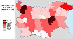 The previous 2001 census recorded 370,908 Romani (4.7% of the population). The preceding 1992 census recorded 313,396 Romani (3.7% of the population), while a secret backstage 1992 census ordered by the Ministry of Interior recorded a figure of 550,000 Romani (6.5% of the population); the Ministry of Interior ordered at least two other secret censuses to enumerate the Romani in denial, the one in 1980 recorded 523,519 Romani, while the one in 1989 recorded that the number of the Romani was 576,927 (6.5% of the population) and that over half of the Romani identified as Turks.[10] The majority of the estimated 200,000-400,000 Muslim Romani tend to identify themselves as ethnic Turks,[11] some deny their origin, or identify as Bulgarians.