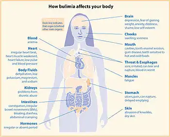People with bulimia are at a higher risk to have an affective disorder, such as depression or general anxiety disorder. One study found 70% had depression at some time in their lives (as opposed to 26% for adult females in the general population), rising to 88% for all affective disorders combined.[27] Another study in the Journal of Affective Disorders found that of the population of patients that were diagnosed with an eating disorder according to the DSM-V guidelines about 27% also suffered from bipolar disorder. Within this article, the majority of the patients were diagnosed with bulimia nervosa, the second most common condition reported was binge-eating disorder.[28] Some individuals with anorexia nervosa exhibit episodes of bulimic tendencies through purging (either through self-induced vomiting or laxatives) as a way to quickly remove food in their system.[29] There may be an increased risk for diabetes mellitus type 2.[30] Bulimia also has negative effects on a person's teeth due to the acid passed through the mouth from frequent vomiting causing acid erosion, mainly on the posterior dental surface.