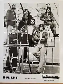 According to vocalist Ernie Sorrentino, he was asked to provide a lead vocal for the Lanny Lambert and Bobby Flax song, "White Lies, Blue Eyes," which had been recorded with studio instrumentalists some weeks before with Flax and Lambert singing harmony vocals. The producers, satisfied with the result, asked Sorrentino to record "Changes of Mind" for the B side, a song that he and drummer Mike Micara had written for their current band. The record was released on the Big Tree Records label under the name "Bullet" in December 1971. As "White Lies" quickly ran up the charts, guitarist Paul Granato was recruited along with keyboard/trumpet player Roget Pontbriand, and other members of the New York band Riverside Drive, to fill out a touring band. Pontbriand relates that "a booking agent named John Apostle was asked to put a band together. At that time, I had been playing with Joey Stann and the late George Ruiz at an upper-Manhattan club called Churchill's Plum. John knew us and asked us to be part of Bullet along with Sorrentino and a drummer named Mike Micara. ... We shot the promotional photos for Bullet in Central Park the day after we met Ernie."[1] The new band appeared on American Bandstand on March 11, 1972, performing "White Lies" and "Willpower Weak, Temptation Strong."