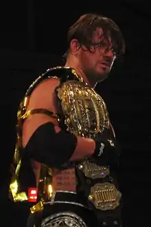 Later at Invasion Attack 2014, American wrestler A.J. Styles debuted as the newest member of Bullet Club, attacking IWGP Heavyweight Champion Kazuchika Okada. Styles, who knew Okada from their days working together for the Total Nonstop Action Wrestling (TNA) promotion, claimed that Okada was still the same "young boy" (rookie) he had known in TNA and asserted himself as the next challenger for his title.[113][117] Following Invasion Attack 2014, with Styles still working a full schedule on the American independent circuit and only booked to work NJPW's larger events,[118] Anderson was positioned as the new leader of Bullet Club.[119][120] However, Styles was considered the leader of the ROH version of Bullet Club,[121] a role which was also given to him by NJPW by the end of 2015.[122] Styles, however, has maintained that he was never the leader as, according to him, the group "[did not] follow anybody".[123] On May 3 at Wrestling Dontaku 2014, Styles defeated Okada to become the new IWGP Heavyweight Champion, when Yujiro Takahashi turned on Okada and the Chaos stable and jumped to Bullet Club, becoming its first Japanese member.[124][125] With Bullet Club capturing NJPW's top title, while also holding both of its tag team titles, and adding new members, this was billed as a "rebirth" for the stable, which was celebrating its one-year anniversary during the event.[126]