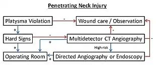 Due to the advances in diagnostic imaging, management of PNI has been shifting from a "zone-based" approach, which uses anatomical site of injury to guide decisions, to a "no-zone" approach which uses a symptom-based algorithm.[25] The no-zone approach uses a hard signs and imaging system to guide next steps. Hard signs include airway compromise, unresponsive shock, diminished pulses, uncontrolled bleeding, expanding hematoma, bruits/thrill, air bubbling from wound or extensive subcutaneous air, stridor/hoarseness, neurological deficits.[25] If any hard signs are present, immediate surgical exploration and repair is pursued alongside airway and bleeding control. If there are no hard signs, the person receives a multi-detector CT angiography for better diagnosis. A directed angiography or endoscopy may be warranted in a high-risk trajectory for the gunshot. A positive finding on CT leads to operative exploration. If negative, the person may be observed with local wound care.[25]