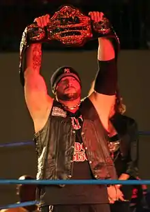 On the February 21 episode of Impact Wrestling, Hogan named Ray the number one contender to the TNA World Heavyweight Championship.[94] Ray received his shot in a steel cage match on March 10 at Lockdown, where he defeated Jeff Hardy, following interference from Aces & Eights, to win his first World Heavyweight Championship. Afterwards, Ray revealed himself as the President of Aces & Eights, turning heel again in the process, and reuniting with Devon.[95] Ray made his first televised title defense on the April 11 episode of Impact Wrestling, defeating Jeff Hardy in a Full Metal Mayhem match to retain his title.[96] On June 2 at Slammiversary XI, Ray successfully defended the World Heavyweight Championship against Sting in a No Holds Barred Match after an interference by Aces & Eights, with the added stipulation, that Sting would never get another World title opportunity again.[97] Following Slammiversary, Ray and Aces & Eights would continue feuding with Sting and his New Main Event Mafia (Kurt Angle, Magnus, Samoa Joe, and Rampage Jackson).[98][99][100][101] On July 18, during the Destination X episode of Impact Wrestling, Ray lost the TNA World Heavyweight Championship to Chris Sabin, ending his reign at 130 days.[102] Ray received his rematch in a steel cage on August 15 at Impact Wrestling: Hardcore Justice, where he defeated Sabin, following interference from Mr. Anderson and Tito Ortiz, to regain the TNA World Heavyweight Championship.[103] On the August 22 episode of Impact Wrestling, Ray revealed his marriage with Brooke Hogan fell apart as he broke up with her, and announced his relationship with Brooke Tessmacher. Later that night, Devon was forced to leave TNA after being pinned by A.J. Styles in a five-on-five tag team match against the Main Event Mafia.[104] The following week, tension began to be teased between Bully Ray and Aces & Eights Vice-President Mr. Anderson, with Anderson disagreeing with Ray claiming he never needed Devon and bring Tito Ortiz into the stable without a group vote.[105] During Ray's match with Sting on the September 5 episode of Impact Wrestling, Anderson cost Ray by refusing to help him. Afterwards, Anderson attacked Ray and announced that he would be his challenger at No Surrender.[106] The following week, Ray successfully defended his title against Anderson in a Last Man Standing match. Afterwards, as Anderson was being stretchered away, Ray attacked him and piledrived him onto the stage.[107] While beginning a feud with Bound for Glory Series winner A.J. Styles, Ray was also dealing with the implosion of Aces & Eights.[108][109][110] On October 20 at Bound for Glory, Ray lost the TNA World Heavyweight Championship to Styles in a No Disqualification match, ending his reign at 66 days.[111]