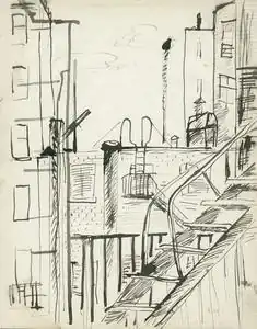 Usui showed a flower painting in the first-known public exhibition of his work in 1922 and he continued to produce floral pieces and still lifes during the rest of his career.[11][6][33][36] See, for example, his "Still Life: Kuniyoshi's Studio" of 1930 and "Cat in the Window" of 1932, images number 6 and 7, as representative paintings in this genre. Two years later he made a painting called "14th Street" (shown here, image number 1) that was, many years later, said to suggest the precisionist cityscape style of the 1920s and 1930s.[3][47] Later in his career he made other cityscapes of a different character. See, for example, "Bronx" and "Backyard Staten Island", both painted in 1933 (images number 8 and 9).