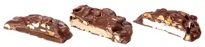 The forerunners of Bun Bars were originally created in the 1920s by the Wayne Bun Candy Company in Fort Wayne, Indiana. The Vanilla Cream Bun of 1947 was the first receiving the Bun name.[1] Wayne Candies and their Bun Bars went through a string of corporate owners in the second half of the twentieth century. The first, the Leaf Confectionery subsidiary of W. R. Grace sold Wayne Candies in 1973 to Standard Brands' Curtiss Candy Company. Under Curtiss, they repackaged caramel Bun Bars as the Reggie! Bar in 1978, named for baseball star Reggie Jackson.[1] When Standard merged with Nabisco in 1981, Wayne Candies was briefly shut down before being sold to German confectioner August Storck KG.[1][2] Then in 1992 it passed to Pittsburgh Food & Beverage Company.[3] Wayne's sister firm under Pittsburgh Food & Beverage, D. L. Clark Company, marketed another sports-themed caramel variety, the Mario Bun, honoring National Hockey League star, Mario Lemieux.[4] Clark also produced a Reggie! Bar, this time with peanut butter filling.[5]