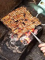 Bún chả (Vietnamese: [ɓǔn ca᷉ː]) is a Vietnamese dish of grilled pork and noodles, which is thought to have originated from Hanoi, Vietnam.[1] Bún chả is served with grilled fatty pork (chả) over a plate of white rice noodles (bún) and herbs with a side dish of dipping sauce. The dish was described in 1959 by Vietnamese food writer Vu Bang (1913–1984), who described Hanoi as a town "transfixed by bún chả." Hanoi's first bún chả restaurant was on Gia Ngư, Hoàn Kiếm District, in Hanoi's Old Quarter.[2][3][4]