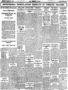 Thomson began the immunisation program on 17 January 1928, with each recipient intended to receive three inoculations spaced one week part.[7] The program was without incident until 27 January, when a total of 21 children between the ages of one and nine were inoculated.[8] Within seven hours, 18 of the children were seriously ill with symptoms that began with vomiting and diarrhoea and progressed to fever, cyanosis, convulsions and unconsciousness.[9] Eleven children died within 24 hours of their inoculations, while another died on the following day; many died only hours after being admitted to hospital.[6] Three were from a single family, the Robinsons,[10] while two other families lost two children. Thomson's son was among those inoculated, but survived.[6]