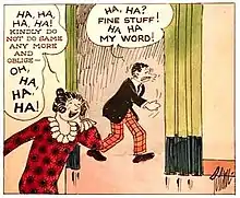 George was skinny, middle-aged, cucumber-nosed and mustachioed, sort of like A. Mutt, Andy Gump or the self-caricatures of R. Crumb. Josie was his equivalent, not a dowdy old frump, but about as comfortably domestic looking as Mutt's or Andy's wife, or to cite a more recent example, Mrs. Ferd'nand. They were typical lower middle class city people of the time, living in a walk-up apartment and having frequent run-ins with the landlord, bill collectors, neighbors and most of all, each other. George and Jo would fight over practically anything. Their disputes frequently went on for hours, provoked noise complaints to the police, dragged the neighbors in, or all three. They were not very likable, and certainly not high-minded. But they were funny. Through them, Tuthill displayed a sort of amused contempt for the more petty concerns of ordinary urban life. The Bungles weren't the sort of folks most people would want to live downstairs from, but they were very much capable of providing entertainment for those who didn't have to put up with them in person.[1]