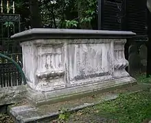John Bunyan, author of Pilgrim's Progress, died in August 1688. He was initially buried in the "Baptist Corner" at the back of the burial ground, on the understanding that his remains would be moved into the family vault of his friend John Strudwick when that was next opened for a burial. There is no certain evidence as to when (or even if) this was done: the probability, however, is that it occurred when Strudwick himself died in 1695, and certainly Bunyan's name was inscribed on the side of the monument.[12] The Strudwick monument took the form of a large Baroque stone chest. By the 19th century, this had fallen into decay, but in the period following the closure of the burial ground a public appeal for its restoration was launched under the presidency of the 7th Earl of Shaftesbury. This work was completed in May 1862, and comprised a complete reconstruction of the monument, undertaken by the sculptor Edgar George Papworth Senior (1809–1866).[13] Although Papworth retained the basic form of the tomb-chest, he added a recumbent effigy of Bunyan to the top of it, and two relief panels to its sides depicting scenes from Pilgrim's Progress. The monument was further restored in 1928 (the tercentenary of Bunyan's birth), and again after World War II (following serious wartime damage to the effigy's face).[14][15]