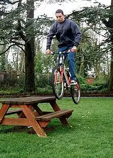 The bunny hop or bunnyhop, is a bicycle trick that allows the rider to launch their bike into the air as if jumping off a ramp. The pedals on the bicycle seem to stick to the rider's feet as the bike becomes airborne, much like how a skateboard seems to stick to the feet of the skater performing an Ollie. While the bunny hop can be quite challenging to learn, once mastered it opens up a whole new level of riding opportunities for both BMX and mountain bike rider alike.[1]