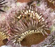 There are typically 80 conical tentacles arranged in three or four rings around the oral disc, but individuals vary and may have more or fewer tentacles. The basic color of the tentacles is the same as the column, and some individuals may show rose, purple or orange tints. The tentacles are often marked with white at their base. Tentacles are slightly shorter than the width of the oral disc.[2]