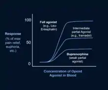Buprenorphine binds strongly to opioid receptors and acts as a pain-reducing medication in the central nervous system (CNS). It binds to the μ-opioid receptor with high affinity, which produces the analgesic effects in the CNS. It is a partial μ-opioid receptor agonist and a weak κ-opioid receptor antagonist. As the dose of buprenorphine increases, its analgesic effects reach a plateau, and then it starts to act like an antagonist.[23][24] As a partial agonist, buprenorphine binds and activates the opioid receptors, but has only partial efficacy at the receptor relative to a full agonist, even at maximal receptor occupancy. It is thus well-suited to treat opioid dependence, as it produces milder effects on the opioid receptor with lower dependence and habit-forming potential.