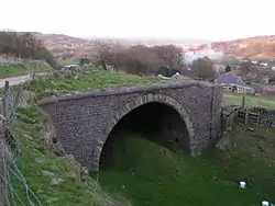 ![]() Disused railway bridge, Burbage,which carried the old Macclesfield Road over the line. Viewed looking NE over Burbage and Buxton. The bridge is completely filled some 15 yards in. To the north lies the 500 yd Burbage Tunnel which took the line into the Goyt Valley. | |