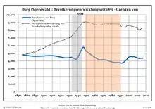 Development of Population since 1875 within the Current Boundaries (Blue Line: Population; Dotted Line: Comparison to Population Development of Brandenburg state; Grey Background: Time of Nazi rule; Red Background: Time of Communist rule)