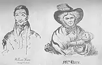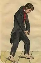 William Hare was probably born in County Armagh, County Londonderry or in Newry. His age and year of birth are unknown; when arrested in 1828 he gave his age as 21, but one source states that he was born between 1792 and 1804.[18][22] Information on his earlier life is scant, although it is possible that he worked in Ireland as an agricultural labourer before travelling to Britain. He worked on the Union Canal for seven years before moving to Edinburgh in the mid-1820s, where he worked as a coal man's assistant.[18][22] He lodged at Tanner's Close, in the house of a man named Logue and his wife, Margaret Laird, in the nearby West Port area of the town. When Logue died in 1826, Hare may have married Margaret.[lower-alpha 1] Based on contemporary accounts, Brian Bailey in his history of the murders describes Hare as "illiterate and uncouth—a lean, quarrelsome, violent and amoral character with the scars from old wounds about his head and brow".[2] Bailey describes Margaret, who was also an Irish immigrant, as a "hard-featured and debauched virago".[23]
