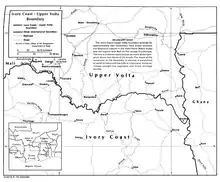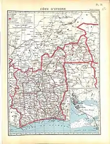 The internal divisions of AOF underwent several changes during its existence; what are now Mali, Niger and Burkina Faso were initially united as Upper Senegal and Niger, with Niger constituting a military territory ruled from Zinder.[2] The Niger military territory was split off in 1911, becoming a separate colony in 1922, and Mali and Upper Volta (Burkina Faso) were constituted as separate colonies in 1919.[4][2] During the period 1932–47 Upper Volta was abolished and its territory split out between French Sudan, Niger and Ivory Coast, with the latter gaining the bulk of the territory, re-named "Haute Côte d'Ivoire".[2][4] The precise date the Ivory Coast–Upper Volta boundary was drawn appears to be uncertain – it is thought to have been drawn at the time of the formal institution of Upper Volta in 1919, based upon the rough delimitation of Ivorian territory by France in 1899.[2][4]