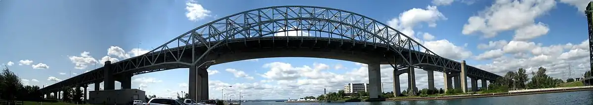 ![]() The Burlington Bay James N. Allan Skyway, taken in July 2004. The 1958 steel arch span carries QEW Toronto-bound traffic, and is in front of the 1985 concrete span, which carries Niagara-bound traffic. In the background is the Hamilton Harbour. | |
