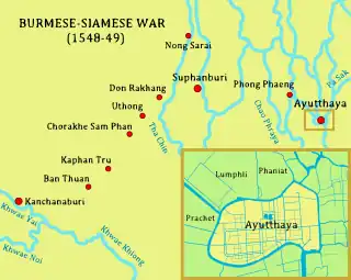The invasion initially met little resistance, as the Burmese forces were too large for the small guard posts around the border.[24] Upon hearing of the Burmese invasion, Maha Chakkraphat mobilized his kingdom, then gathered his forces at Suphanburi, a town just west of Ayutthaya.[32] When Tabinshwehti and his army arrived at the walled town of Kanchanaburi, they found it completely deserted.[33] About a month into the invasion, mid-November 1548,[note 5] the King of Burma then continued his march eastward, capturing the villages of Ban Thuan, Kaphan Tru, and Chorakhe Sam Phan.[33] The Burmese continued their advance and captured the ancient town of Uthong as well as the villages of Don Rakhang and Nong Sarai and closing in on Suphanburi. When the Burmese attacked the town, Siamese defenders could not withstand the onslaught and retreated towards Ayutthaya. Tabinshwehti ordered his army southeast along two canals, and crossed the Chao Phraya river near Phong Phaeng. From here he encamped his army directly north of the Siamese capital of Ayutthaya on a field called the Lumpli plain.[33]