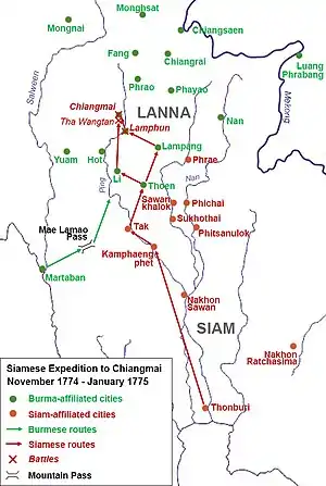 King Taksin of Thonburi decided to renew an expedition to Chiangmai in 1774 due to the fact that the Burmese of Northern Lanna had harassed several Siamese border towns including Phichai and Sawankhalok. Thonburi court also heard of Hsinbyushin's grand plan to invade Siam from both northern and western directions. Taksin then conducted the pre-emptive strike on the Burmese at Chiangmai as follows;[8]