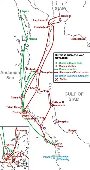 The Burmese–Siamese War (1809–1812) or the Burmese Invasion of Thalang was an armed conflict fought between Burma under Konbaung dynasty and Siam under the Chakri dynasty, during the period of June 1809 and January 1812. The war centered on the control of the Phuket Island, also known as Thalang or Junk Ceylon, and the tin rich Andaman Coast. The war also involved the Kedah Sultanate.[3] This occasion was the last[2] Burmese offensive expedition into Siamese territories in Thai history, with British acquisition of the Tenasserim Coast in 1826, following the First Anglo-Burmese War, removing several hundred miles of the existing land border between Siam and Burma. The war also left Phuket devastated and depopulated for many decades until its reemergence as a Tin mining center in the late 19th century.
