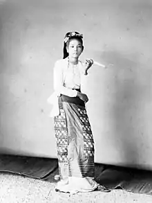Dress was a major cultural aspect of life in pre-colonial Burmese kingdoms. Foreign travelers reported the presence of a loom in every household, enabling every women to weave their family's everyday clothing.[2] Vincenzo Sangermano, an Italian priest who was posted in the Konbaung kingdom at the turn of the 19th century, observed that locals were "splendid and extravagant in their dress."[3] Ear-boring ceremonies for girls was a major rite of passage. Locals adorned themselves with gold and silver, including rings set with precious stones, necklaces, bracelets, and anklets.[3] These accessories accompanied traditional attire, consisting of a sarong-like wrap – paso for men or a htamein for women – both of which were made of cotton or silk.[3] Wooden or leather sandals were worn as footwear.[3] Men and women alike dressed in their finest attire, including ornamented jackets, for visits to pagodas and other important events.[3]