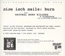 "Burn" is a song recorded by US industrial rock band Nine Inch Nails for the soundtrack to the 1994 film Natural Born Killers. It was released as a promotional single from the soundtrack. The song was included as a bonus track on the 10th anniversary deluxe edition of The Downward Spiral in 2004. Live performances of the song are featured on KROQ Christmas 2005 and the concert film Beside You in Time.