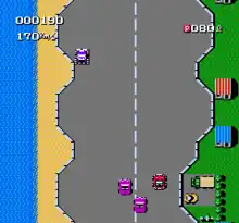The enemy vehicles are cars and trucks. Cars can be bumped into obstacles or jumped upon and destroyed, while trucks cannot be bumped; they can only be jumped upon to destroy them, and will sometimes drop obstacles that will destroy the player or one extra life. At the end of each level players receive bonus points for the number of enemy vehicles crashed. Going from one level to another is characterized by a change of seasons. Players get points for bumping other cars and causing the other cars to crash. If the player completes a level without destroying another car by bumping it or jumping on it, the player receives a 50,000-point bonus.