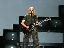 For 2004's Re-Invention World Tour, it was performed in a rock-style version with the singer playing a black Gibson Les Paul electric guitar.[58] She was dressed in military fatigues while the screens behind her depicted scenes of war and sex which, according to The New York Times' Kelefa Sanneh, look liked they were filmed with a camcorder and were reminiscent of the prisons in Abu Ghraib.[59] The Daily Herald's Mark Guarino praised Madonna's ability to "transform the song's original adolescent whine into adult certitude";[60] Neva Chonin, writing for the San Francisco Chronicle, deemed the performance a "singer-songwriter spotlight as Madonna showed off her competent guitar skills".[61]