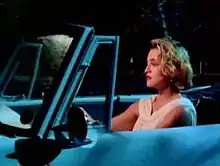 Rolling Stone staff described the video as a juxtaposition of "disparate images of illuminated busts and cars driving on water with Madonna writhing in the middle of the road".[44] The narrative shows Madonna proclaiming her passion for her lover, being portrayed as a "helpless" victim and a "stereotyped [female] portrayed in many silent movies".[46] Though lyrics such as "Do you want to see me down on my knees?" portray female helplessness, the video acts as a counter-text;[49] when this line is sung, Madonna is shown kneeling on the road in front of the advancing Amphicar, then turns her head back while exposing her throat back in a posture of submission. However, her voice tone and her look at the camera portray a hardness and defiance that contradict the submissiveness of her body posture and turn the question of the line into a challenge for her lover.[49] At the end of the video, it is her who is driving the car, with a knowing, defiant smile on her lips. She has ditched the man, thereby giving the message that she is in charge. This theme would become recurrent throughout her career.[46]