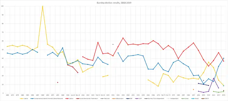 At the 2019 election, Antony Higginbotham won the seat for the Conservatives, thus becoming the first Conservative to represent Burnley in parliament for over 100 years.[4] The Conservative vote share increased by over 9% compared with the previous election, while the Labour vote share declined by about 10%.[5]