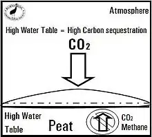 Burns Bog plays a major role in climate regulation. It helps to maintain the health of nearby creeks, which are critical salmon-bearing sites. The peat in the bog does this by cooling and filtering rainwater that comes in. This water then leaches into these salmon-bearing creeks. Burns Bog is also a major carbon sink. Since organic matter decomposes at a very slow rate in the bog, carbon stays in the bog. High acidity and the waterlogged conditions of peatlands such as Burns Bog prevent complete decomposition of fixed carbon.[4] This prevents the carbon from escaping into the atmosphere. European scientists state that an area of peatland the size of a soccer field stores as much carbon as would be generated by driving a family car around the world three times.[5]