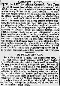 The map of Brentor of 1809 shows that the Burnville Estate was then called East Langstone (or Longstone). At this time it was owned by William Sleman (1780-1814) who possibly built the house. In 1802 he married Agnes Cundy (1776-1831) who was also from the parish of Lamerton and the couple had three children. Unfortunately William died in 1814. The death notice is given at this reference.[3] In the same year the house and the nearby farm were advertised separately as rental properties. The notice is shown. The house is described in the following terms.