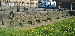 The remains of Bury Castle drew public attention in 1973 when amateur archaeologists uncovered stonework that had previously lain underneath a car park.[4] The site, which is owned by Bury Council and has undergone "restoration and enhancement work", has been open to the public since 2000.[3][5] Bury Castle is about 3.3 km (2.1 mi) north of Radcliffe Tower, an early 15th-century moated manor house.