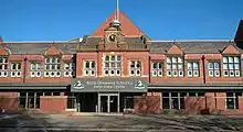 In 1900, the school was taken over by the governors of the Grammar School and was renamed Bury Grammar School for Girls.[3] Almost immediately, plans evolved for a new building, to be shared by the boys’ and girls’ schools. The new building was funded in part by the governors and in part by grants from the Hulme Trust; there were also donations of land and money from the Earl of Derby.[4] The new buildings, of Accrington brick, were designed in a simple Neo-Renaissance style by William Venn Gough.[5] In 1903 the boys' school moved from its existing premises in The Wylde to half of the current girls' school site;[6] the following year, the cornerstone of the girls' school was laid. The girls moved in on completion of this part of the building in 1906.