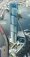 The tower is the centerpiece of the new Busan Lotte Town and construction is being carried out in four phases. The first phase includes a department store, completed in 2009. During the second phase, an addition to the department store was completed in 2010. The third phase will be a market and a cinema, which was completed in 2014, and the last phase will include a luxury hotel, an observation deck, offices, and cultural facilities in a 107-story skyscraper.[4] The design of the skyscraper is intended to resemble a standing ship, in reference to the city's harbour.[4] The tower's underground parking space will be able to house over 2,400 cars. The tower will contain retail outlets (floors 1–11), offices (12-36), residences (41-78), a luxury hotel (82-104), and public access floors (107-110) with an observation deck.